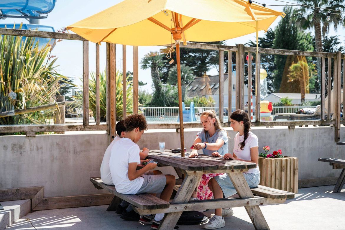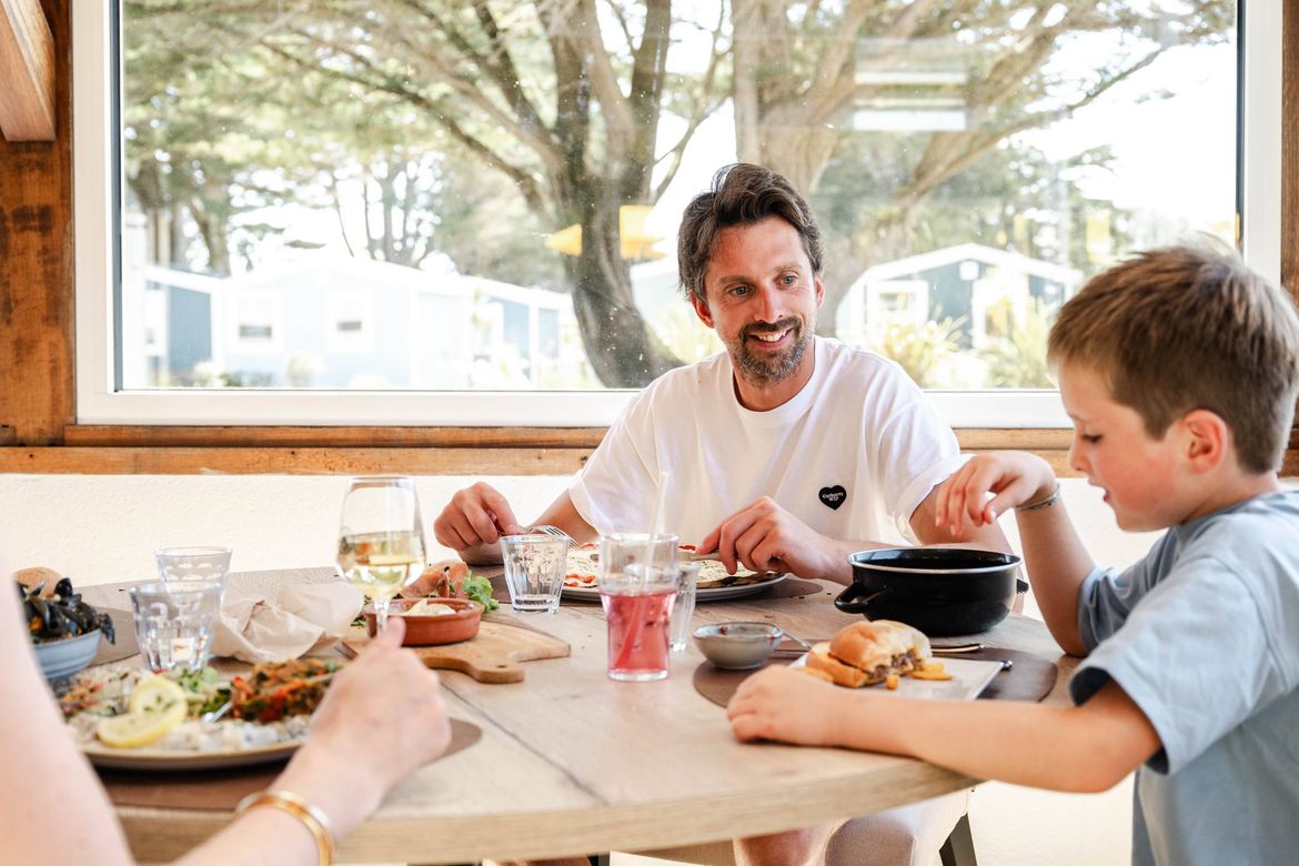 Ubicado en el corazón del camping, entre el escenario de espectáculos, la piscina, el tenis, el minigolf y la zona de juegos infantiles, nuestro espacio de restauración es mucho más que un servicio: es el verdadero punto de encuentro del camping. Un lugar donde los días se alargan de forma natural, donde surgen encuentros y donde se disfruta plenamente de cada momento. El bar, el restaurante y el snack están abiertos durante toda la temporada — desde la apertura hasta el cierre del camping — para que cada instante de su estancia en el sur del Finisterre esté a la altura de sus vacaciones.